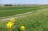 土手の向こうの緑がすべてポピー・麦なでしこ畑。
