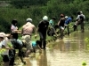 水を貼った田んぼは一歩踏み出すのも難しいけれど、楽しい!田植え体験です