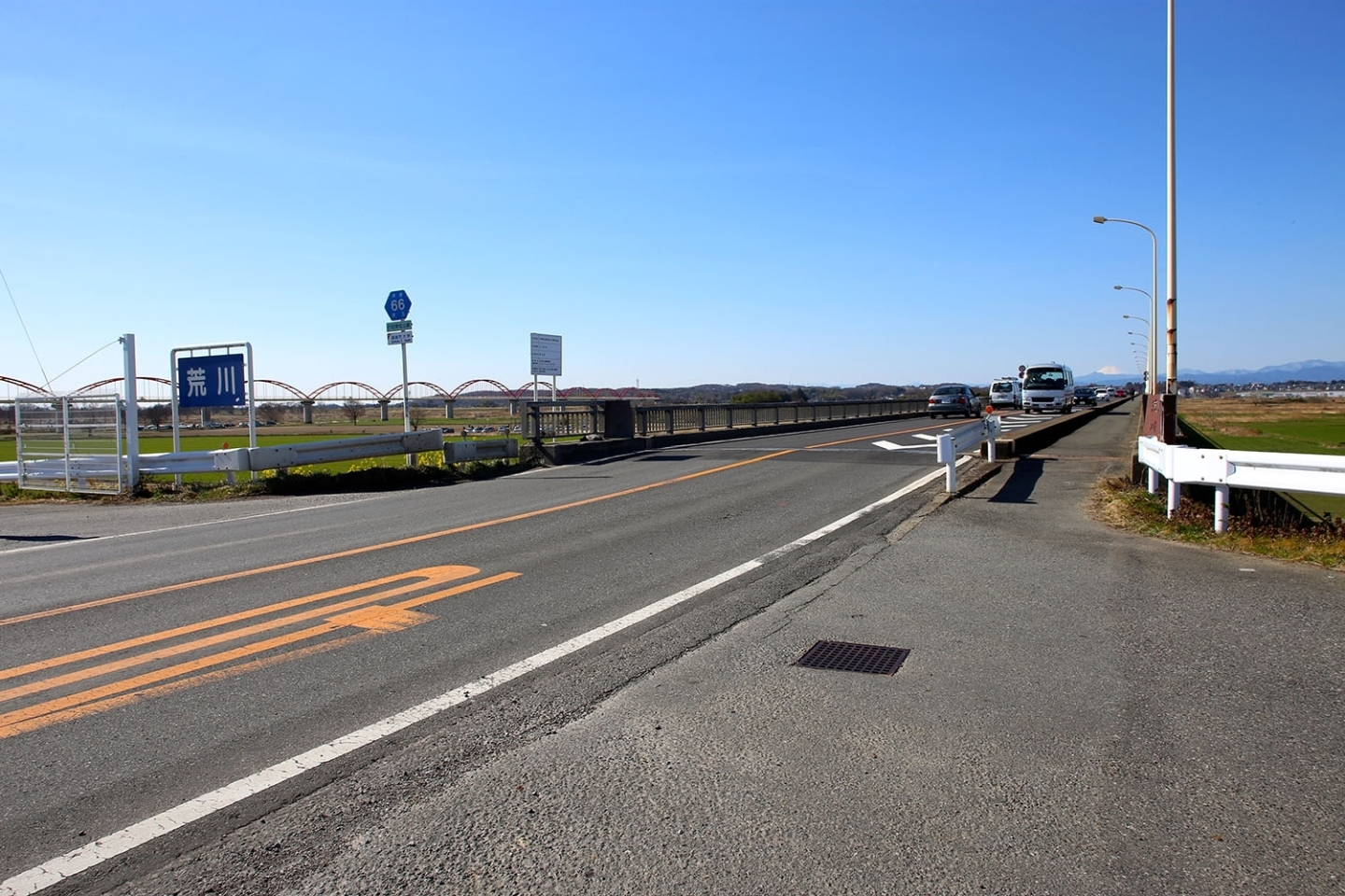 昭和55年に現在の大芦橋が開通しました。全長1,016メートルあり、竣工当時は埼玉県内最長の道路橋でした。これまでのように荒川が増水しても沈下しない永久橋で、幅員9.50メートルの片側には幅2メートルの歩道も整備されています。
