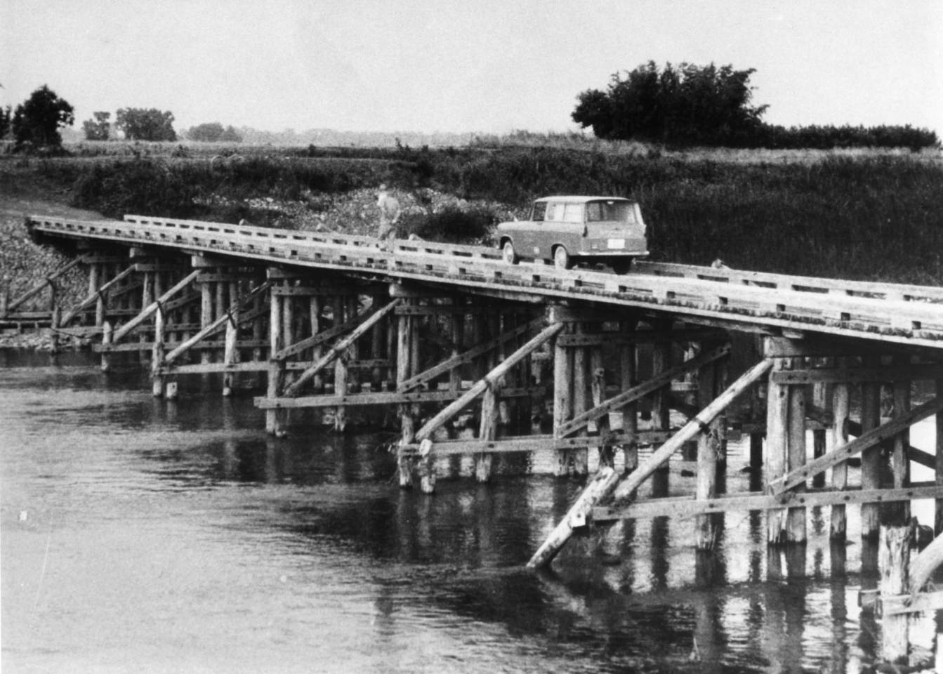 1965年の台風による洪水で壊れた後、鋼管パイル製の橋脚に支えられた木製桁の冠水橋に改修されました。自動車の通行は可能でしたが幅員3.6メートルと狭いため片側交互通行、路線バスは通行できなかったため、橋の手前で折り返していました。