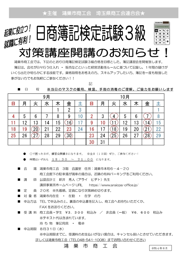 日商簿記検定試験3級対策講座のお知らせ