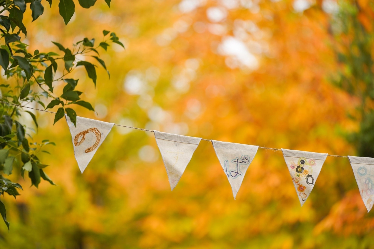 紅葉を背景に手作りガーランドが皆さんを出迎えます