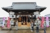 のぼりが飾られ、人でにぎわう氷川八幡神社