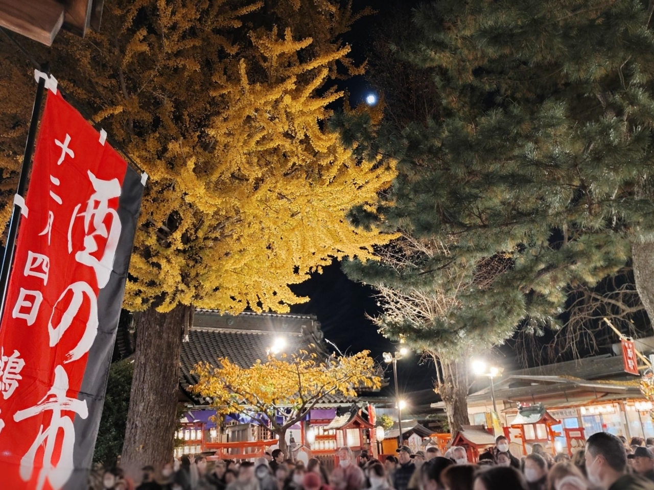 鳥居から参道の左右に露店が立ち並ぶその先、拝殿前に熊手商2軒が熊手を高く掲げた店を構えます。