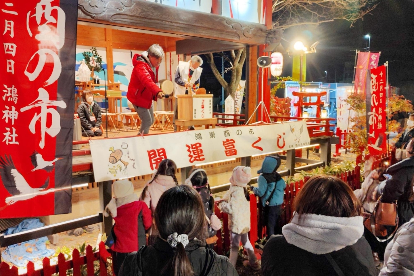 加須市から訪れた会社経営者と家族は、「前までは都内の酉の市に行きましたが、最近は鴻神社で」と言い、西野でお買い物。