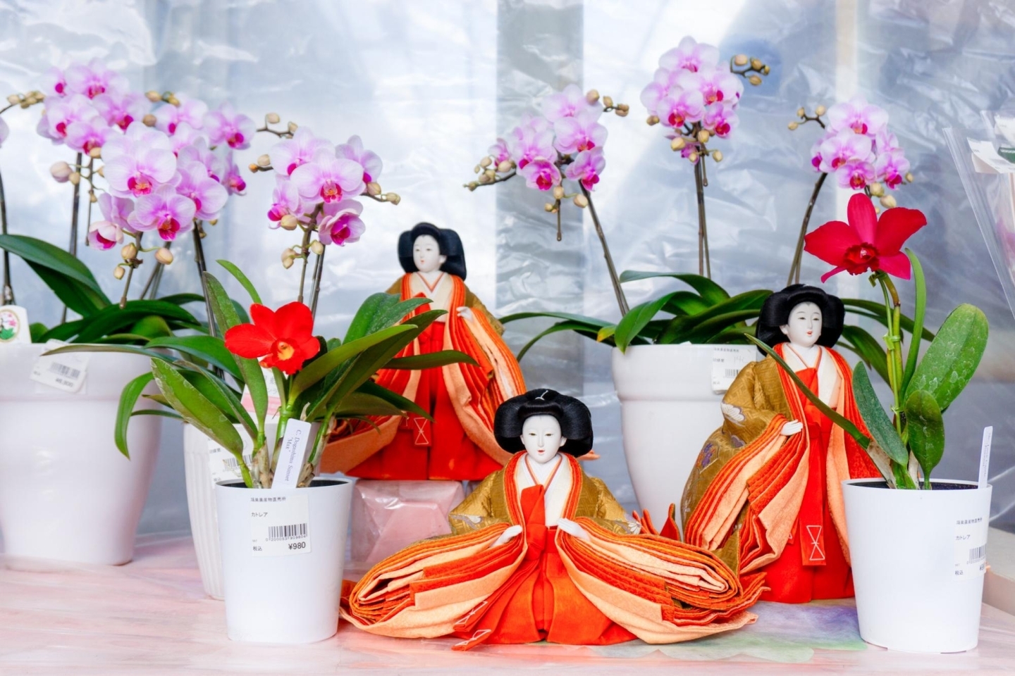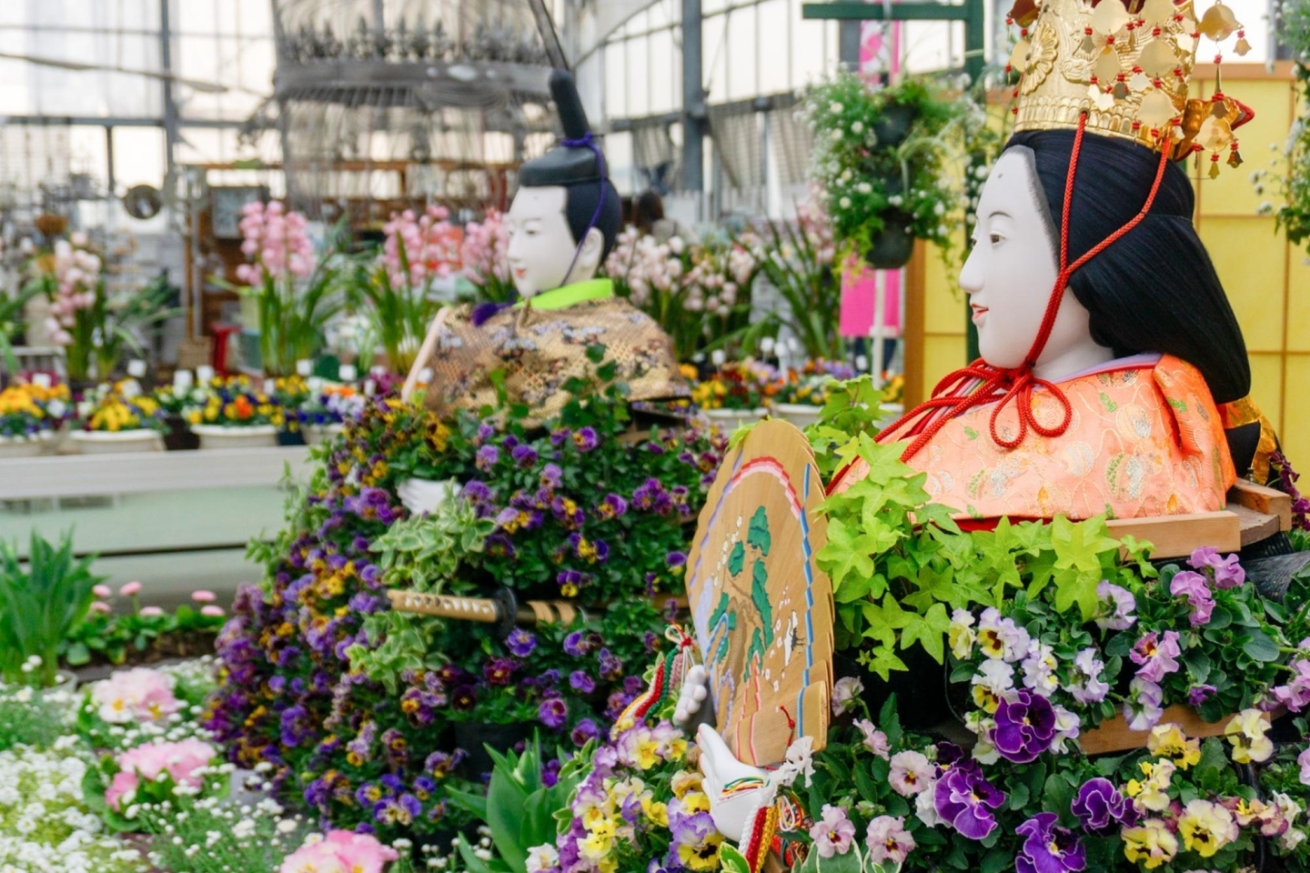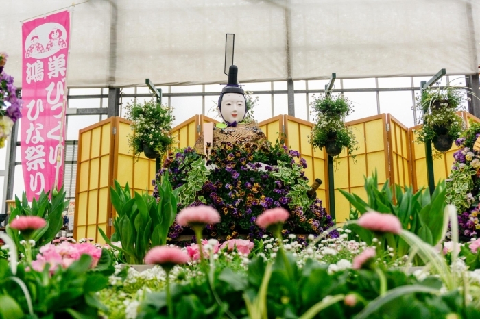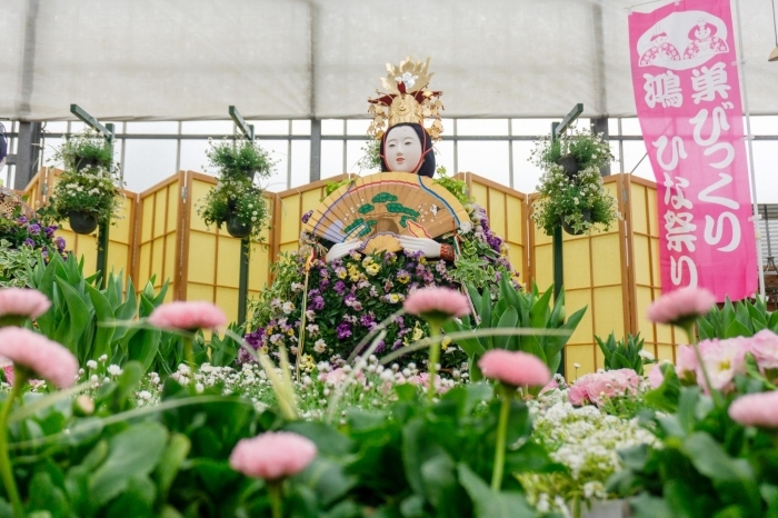 そして10日に設置が完了したのが、花を着飾った等身大ひな人形。