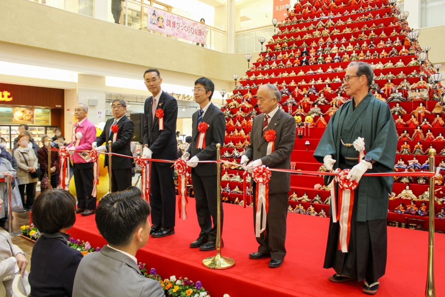 日本一高いピラミッドひな壇の前でテープカットする皆さん