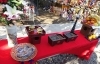 本堂隣の人形供養祭が行われる「人形塚」の前には、ご焼香や供物が用意されています