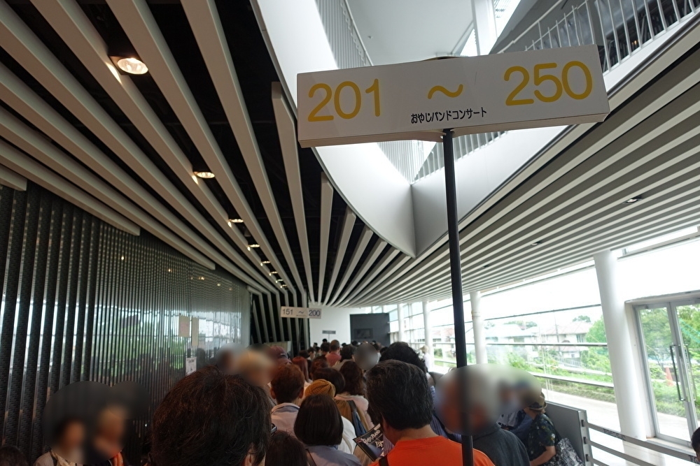 (2019年7月開催時の情報です)「おやじバンドコンサート」は入場無料。チケットの事前配布などはなく、当日11時から整理券が配布されます。開場は12時30分から、整理番号の早い順に50番ずつ入場を案内されました(来場時に渡されるプログラム右上に整理番号が記載されていました)。会場はほぼ満席、立ち見も出るほどの盛況ぶりですが、2、3階席からでも十分ステージを楽しめますし、プログラムが進むにつれて観客の入れ替わりもあるので、開場・開演時刻に合わせて来ても、座って観ることは十分可能。慌てず会場へお越しくださいね。確実にこの場所から見たい!という方は整理券をもらっておくと安心かもしれません。ちなみにこの日、いちばん早い方は朝9時から並んだそう!