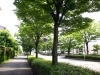 ケヤキ並木の足下に春から秋にかけて白い小さな花が咲くアベリア通り