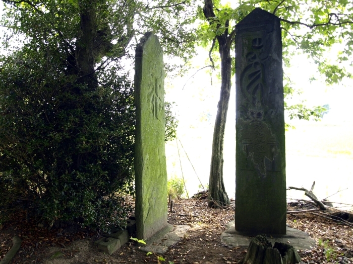 歩道橋を渡って国道17号を横断。田んぼのなかに木にこんもりと覆われた「八幡神社」を見つけます。お堂の後ろには鎌倉時代や室町時代によく建てられ、秩父青石が使われたことから“青石塔婆”とも呼ばれる供養塔“板碑”が2基。想像もつかないほどの長い年月を経て存在する姿は、神秘的でさえあります。
